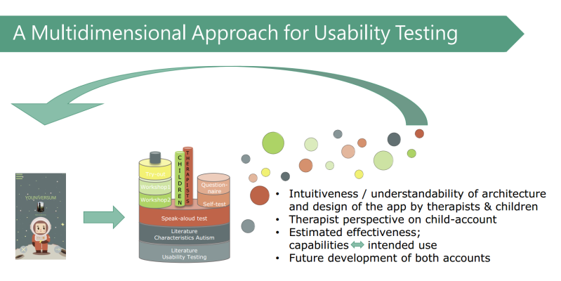 To investigate usability for an app for autistic children, was a quite complex case taking into account the level of user-friendliness of the app. Therefore, I carefully choose different methods and with different stakeholders at certain times to work towards an appropriate way in which the children could be involved by taking into account the problems of autism brings along. Through this step-wise multi-dimensional approach, I have developed a methodology that could also be very relevant for usability research with other (vulnerable) target groups. It would be interesting to publish, aiming to support other researchers-designers to involve these groups in the development process.